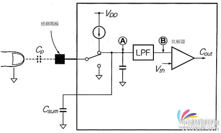 隨著手指的靠近增C 大,VOUT 則變低。一旦停止切換動作,透過定電流源的供應電壓上升,到達默認臨界電壓的時間,隨著切換時的電壓,亦即感測部位的容量改變。