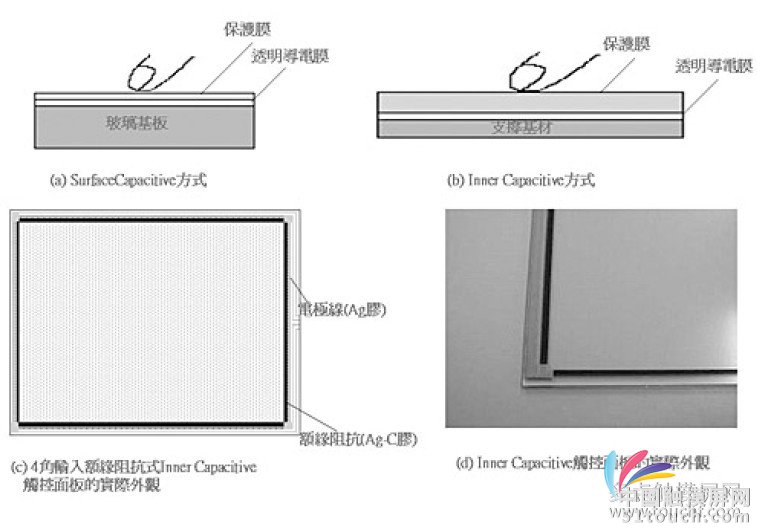 表面電容方式(Surface Capacitive)與投射電容方式相同,都是感測靜電容量的變化,若將投射電容方式視為四線阻抗膜方式,表面電容方式就等于五線阻抗膜方式,其中第五線就是人體。