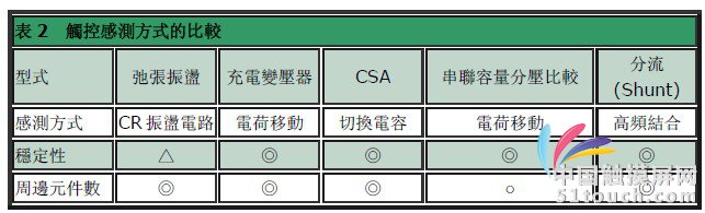 以上介紹觸控面板常用的方式,不過由于近年數(shù)字消費性電子(CE)產(chǎn)品的小型化,無機械接點的觸控切換器(Touch Switch)也開始受到矚目,其使用的靜電容量觸控感測方式也跟著受到重視。近期投入相關靜電容量觸控感測芯片供應廠商包括亞德諾(ADI)、賽普拉斯、飛思卡爾(Freescale)、在2008 年2 月時被Atmel 收購的Quantum Research、奧姆龍(Omron)與羅姆(Rohm)等;表2 是觸控感測方式的比較。