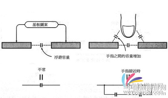 圖4(d)呈現(xiàn)的鋸齒狀為滑塊用,它可以感測手指處于水平方向的方位,應用在類似MP3等歌曲點播、音量調(diào)整,要求以手指橫向操作的產(chǎn)品上。而電容式觸控感測的運作方式如下: