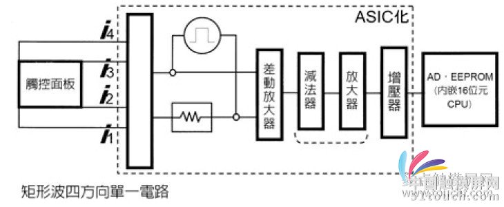 感應電容觸摸屏與表面電容觸摸屏相比,可以穿透較厚的覆蓋層,而且不需要校正。媲美電容式的耐久性,大于5,000 萬次;耐擦傷性大于3H、可負載250 公克的鐵絲球,反復10 次,并進而提高AR 膜片的實力。此外,操作溫度范圍介于-30~+85℃之間,保存溫度范圍則為-40~+95℃。圖16 是表面與內(nèi)部電容方式的比較;圖17 是內(nèi)部電容觸控面板的驅(qū)動電路方塊圖。