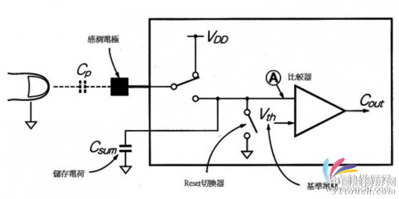 這種方式兼具降低觸控部位的阻抗,以免受到噪訊影響,還可同時感測容量變化的方式。典型例子為Quantum 開發(fā)的充電轉(zhuǎn)換(Charge Transfer)方式。如圖8 所示,充電轉(zhuǎn)換方式是由設定切換器(Reset Switch)與電荷儲存用電容器構成。