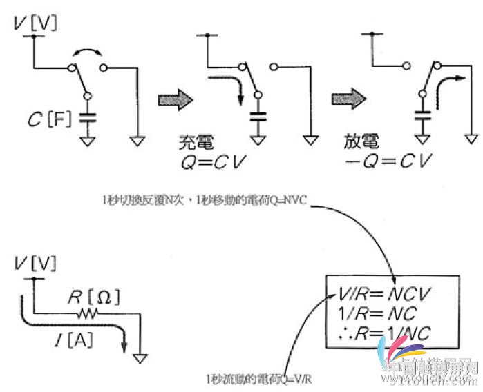 圖 15 是切換容量方式的動作原理,首先將電容器與切換器連接,利用頻率交互進行開關。電壓V 的電源一旦被接通,會將Q=CV 的電荷Q(C)儲存在容量C 的電容器。反復使電容器充電、放電時,CV 的電荷會移動,1 秒鐘反復N 次,呈現(xiàn)Q=NCV 的電荷移動狀態(tài)。圖15 利用電容器制作阻抗接著將電阻器與電源連接進行比較,R(Ω)電阻器的兩端如果施加V(V),流動電流I(A)變成:I=V/RI(A)是指1 秒鐘I(C)的電荷移動,1 秒鐘的Q(C)的電荷移動變成:Q=V/R兩式比較可以發(fā)現(xiàn)從CV=V/R變成NC=1/R,換句話說以N(Hz)切換,相當于連接1/NC(Ω)電阻器進行電荷移動。