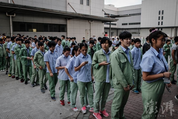 午休前,工人們列隊(duì)離開生產(chǎn)線,軍事化的管理是效率的保證。