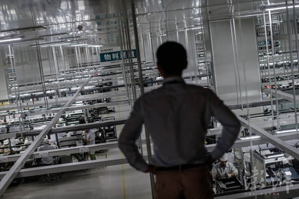 一名員工站在組裝車展的參觀平臺上,與玻璃相隔的A車間是擁有13條整體自動化生產(chǎn)流水線的手機(jī)成品組裝車間。