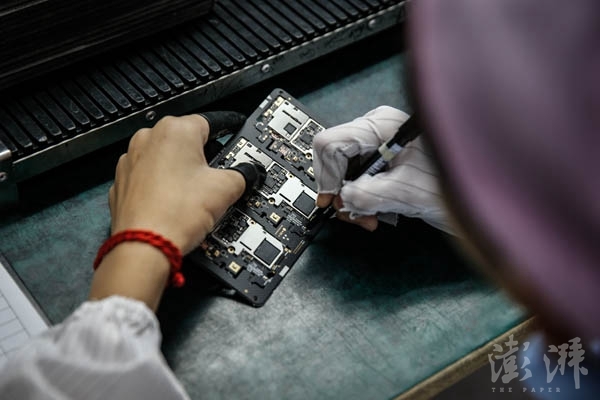 工作人員正在對主板進(jìn)行標(biāo)記。主板生產(chǎn)是除物料采購?fù)?,生產(chǎn)手機(jī)環(huán)節(jié)的第一個(gè)步驟。