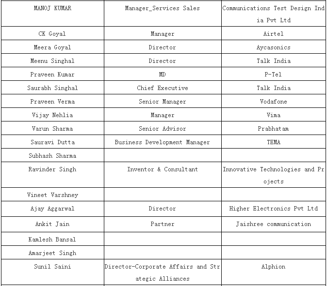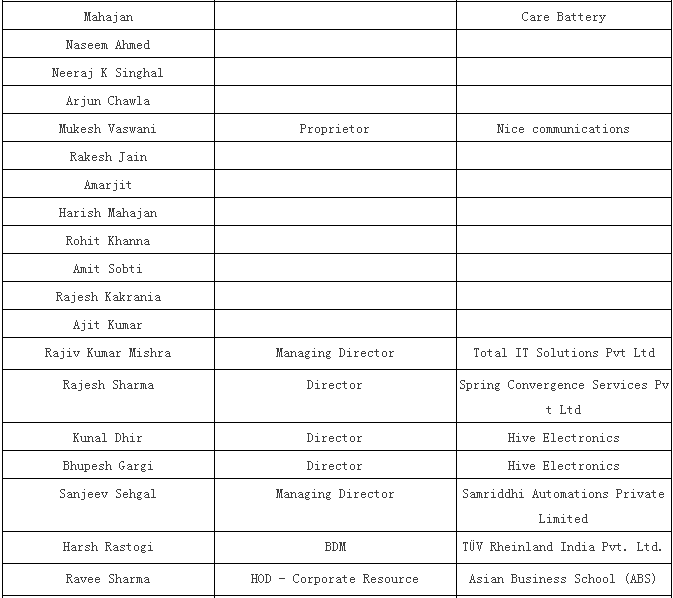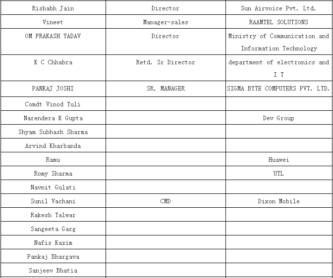 1) Pankaj Mohindroo, National President, Indian Cellular Association (ICA)偏卡舉·牟亨主,印度手機(jī)協(xié)會(huì)國(guó)內(nèi)總裁 2) TECNO 傳音 3) HoliTech 合力泰 4) Micromax (Sunil Joon ) 5) Vivo 6) Mr. Lai, Head - Quality, Sprocomm禾苗質(zhì)量部總監(jiān)賴先生 7) Wind (a Chinese company which is into IDH – designing of PCBA and has set up a factory in Mumbai recently ) (進(jìn)入IDH的中國(guó)公司 – 設(shè)計(jì)PCBA且近期已經(jīng)在孟買建立工廠) |