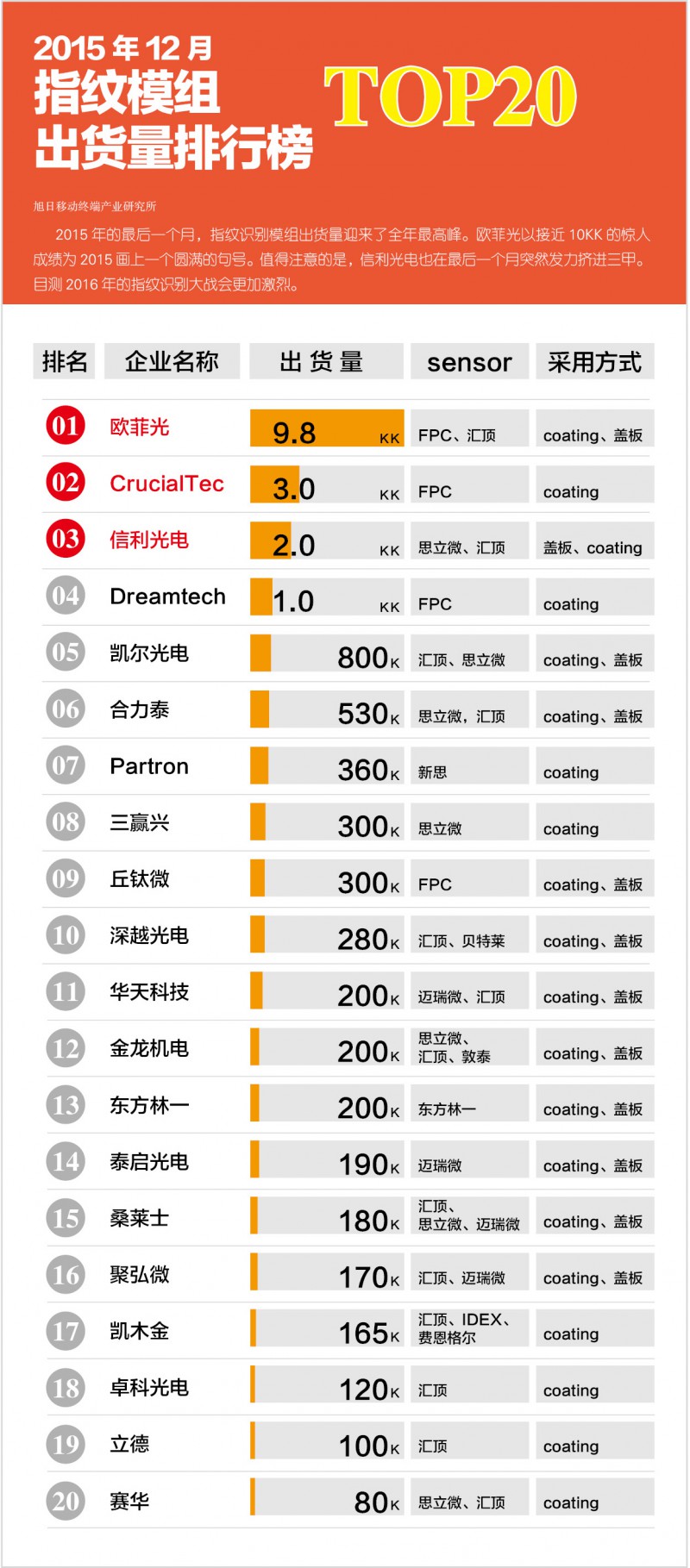 2015年12月指紋模組出貨量排行榜