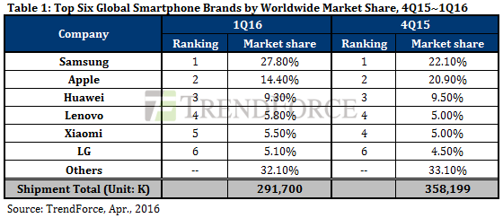 全球市場(chǎng)研究機(jī)構(gòu)TrendFroce最新報(bào)告顯示,2016年第一季全球智能手機(jī)出貨約2.92億部,環(huán)比衰退18.6%,同比則衰退1.3%。主要原因在于智能手機(jī)市場(chǎng)趨近飽和,位于領(lǐng)先地位的三星與蘋果增長(zhǎng)動(dòng)能不再,整體出貨量只能依賴中國(guó)品牌在印度等新興市場(chǎng)提升。