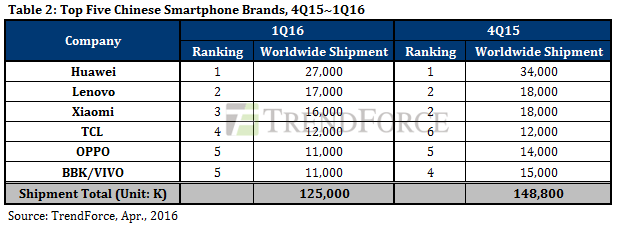 TrendForce智能手機(jī)分析師吳雅婷表示,2016年第一季中國(guó)品牌(含外銷)智能手機(jī)總出貨量首度超越三星與蘋果的加總,高達(dá)1.25億部,占全球比例42.9%,與上季度的41.5%相比,比重持續(xù)升高。即使處于市場(chǎng)淡季,但在中國(guó)內(nèi)地有營(yíng)運(yùn)商加強(qiáng)補(bǔ)貼4G機(jī)型及積極拓展海外市場(chǎng)兩大因素驅(qū)動(dòng)下,中國(guó)品牌智能手機(jī)出貨僅季衰退16%,幅度明顯小于全球其他品牌,國(guó)際品牌大廠生存空間將進(jìn)一步受到擠壓。但由于海外市場(chǎng)競(jìng)爭(zhēng)更趨激烈,中國(guó)品牌智能手機(jī)廠商的獲利率仍有持續(xù)下滑壓力。