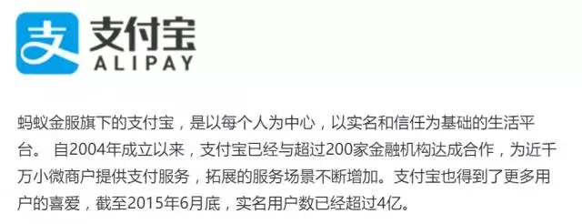 目前,螞蟻金服擁有全球最大的支付平臺(tái)支付寶,實(shí)名用戶已超4億,同時(shí)擁有中國(guó)最大的貨幣基金余額寶,已為用戶盈利超過(guò)400億。