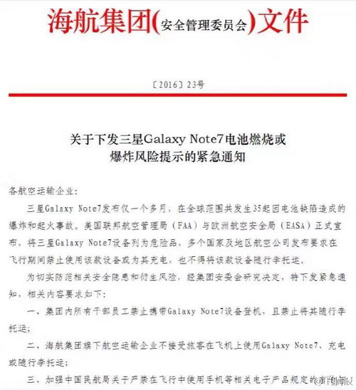 據(jù)海航集團(tuán)官方微博消息,海航集團(tuán)發(fā)通知禁止員工和乘客攜帶三星Note7登機(jī)或者托運(yùn)。通知稱,集團(tuán)員工禁止攜帶Note7登機(jī)、托運(yùn),并且也不接受旅客在飛機(jī)上使用和托運(yùn)Note7。