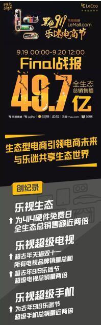 整個(gè)活動(dòng)36個(gè)小時(shí)的時(shí)間,樂(lè)視生態(tài)全平臺(tái)總銷售額達(dá)到驚人的49.7億元,接近此前414硬件免費(fèi)日活動(dòng)的兩倍,其中樂(lè)視會(huì)員就奉獻(xiàn)了27.1億元,占比為55%。