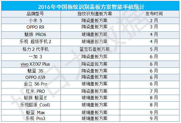 另外,值得一提的是,魅族是全球首次使用玻璃蓋板方案的手機(jī)品牌,樂視則是使用玻璃蓋板方案后大獲成功的品牌,而后魅族和樂視發(fā)布的指紋手機(jī)皆為玻璃蓋板方案為主。而小米為了創(chuàng)造新的賣點(diǎn),搶先成為首次使用陶瓷蓋板方案的品牌,同月發(fā)布的OPPO R9也采用了陶瓷方案,后來小米及OPPO發(fā)布的蓋板指紋手機(jī)皆選擇陶瓷方案。因此目前指紋蓋板應(yīng)用市場主要分為以魅族、樂視等為代表的玻璃蓋板陣營和小米、OPPO等組成的陶瓷蓋板陣營。