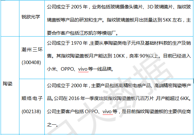 陶瓷潮州三環(huán)(300408)公司成立于1970年,主要從事陶瓷類電子元件及基礎(chǔ)材料款的生產(chǎn)及銷售。其指紋陶瓷蓋板月產(chǎn)能達(dá)到10KK,良率90%以上。目前已經(jīng)進(jìn)入小米、OPPO、vivo等一線品牌。