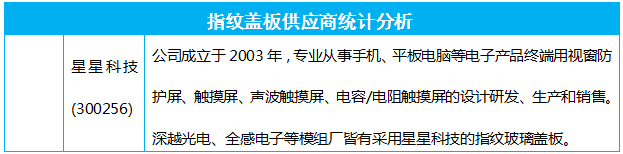 星星科技(300256)公司成立于2003年,專業(yè)從事手機(jī)、平板電腦等電子產(chǎn)品終端用視窗防護(hù)屏、觸摸屏、聲波觸摸屏、電容/電阻觸摸屏的設(shè)計(jì)研發(fā)、生產(chǎn)和銷售。深越光電、全感電子等模組廠皆有采用星星科技的指紋玻璃蓋板。