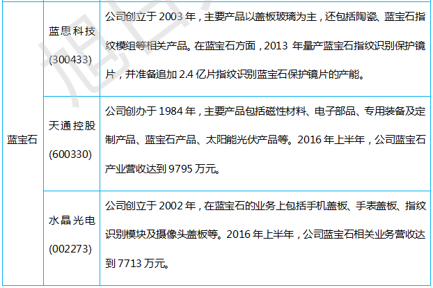 水晶光電(002273)公司創(chuàng)立于2002年,在藍(lán)寶石的業(yè)務(wù)上包括手機(jī)蓋板、手表蓋板、指紋識別模塊及攝像頭蓋板等。2016年上半年,公司藍(lán)寶石相關(guān)業(yè)務(wù)營收達(dá)到7713萬元。