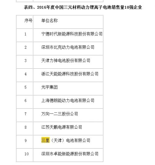 中國化學(xué)與物理電源行業(yè)協(xié)會對國內(nèi)44家動力鋰離子電池企業(yè)2016年度的產(chǎn)量、銷量和銷售收入進(jìn)行的統(tǒng)計分析數(shù)據(jù)顯示,三星天津?yàn)?016年度眾多三元材料動力鋰電子電池銷售量十強(qiáng)企業(yè),名列第九。