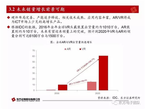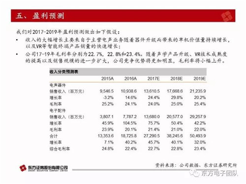科技大廠持續(xù)發(fā)力,虛擬顯示產(chǎn)品前景可期:目前,AR/VR硬件還處于發(fā)展階段,而大陸電子廠商已越來越多地參與到AR/VR產(chǎn)業(yè)的研發(fā)制造中,未來隨著硬件布局完善、產(chǎn)能逐步釋放、相關技術成熟、應用內容豐富,AR/VR將成為ICT市場上少見的高增長產(chǎn)品。歌爾不斷加強自身在虛擬顯示領域的核心競爭力,17年有望借助日系大客戶銷量成倍級的增長,從而帶動公司虛擬顯示產(chǎn)品的收入快速增長。