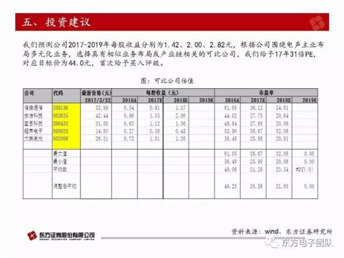 我們預測公司17-19年每股收益分別為1.42、2.00、2.82元,根據(jù)可比公司,我們給予17年31倍PE,對應目標價為44.0元,首次給予買入評級。