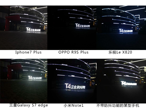 蘋(píng)果手機(jī)不但對(duì)比度平衡做到最好,令較暗的地面磚縫細(xì)節(jié)都清晰可見(jiàn),而且噪點(diǎn)抑制的很到位。三星Galaxy 7 edge整體效果也較清晰,對(duì)比度平衡較好,但噪點(diǎn)略微明顯了些。幾款國(guó)產(chǎn)手機(jī)的成像對(duì)比度過(guò)大,因此地面已全黑,無(wú)法看清地面磚縫了。但是OIS技術(shù)仍然令到圖片的細(xì)節(jié)表現(xiàn)清晰,尤其是OPPO R9S Plus,獲得了極其清晰的亮字圖像,表明其OIS對(duì)焦馬達(dá)具備優(yōu)異的性能。