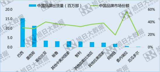 圖表3 2016年中國(guó)品牌在拉美地區(qū)各國(guó)出貨量及市場(chǎng)份額