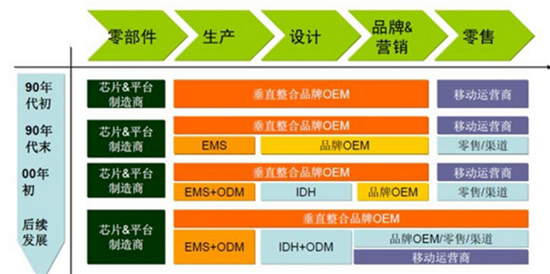 隨后在2006年到2008年之間,國產(chǎn)手機品牌進入低潮,但山寨機卻又蓬勃興起,這背后IDH起了非常重要的作用。在整個手機產(chǎn)業(yè)鏈發(fā)展過程中,IDH處在一個中間的位置,它為手機整機公司提供快速的研發(fā)服務(wù),同時對手機產(chǎn)業(yè)鏈進行整合。