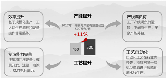 2017年,聞泰的月產(chǎn)能有望增長到450萬臺/月。據(jù)介紹,目前聞泰嘉興工廠產(chǎn)線屬于滿負荷運轉(zhuǎn),保持24小時不間斷生產(chǎn),其余的多余產(chǎn)能外包給富士康、英華達、光弘等代工廠。之所以將四成產(chǎn)能放在嘉興工廠,而將其余產(chǎn)線外包,是因為一般代工廠的產(chǎn)能都會根據(jù)淡季、旺季呈現(xiàn)波峰、波谷,而聞泰的嘉興工廠由于只滿足40%產(chǎn)能,所以不會有波動,可以保證全天24小時,全年365天,滿額產(chǎn)線運作。而剩余的產(chǎn)能可以通過較低的成本找到代工廠來承接,產(chǎn)能波動也會由代工廠來承擔(dān)。