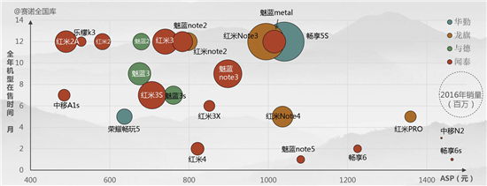 2016年華勤(華為暢享5S)、龍旗(紅米Note3)單品銷量分別占據(jù)1、2位,3——6位都由聞泰機型占據(jù),涵蓋魅族、小米、中移動的主力出貨機型。