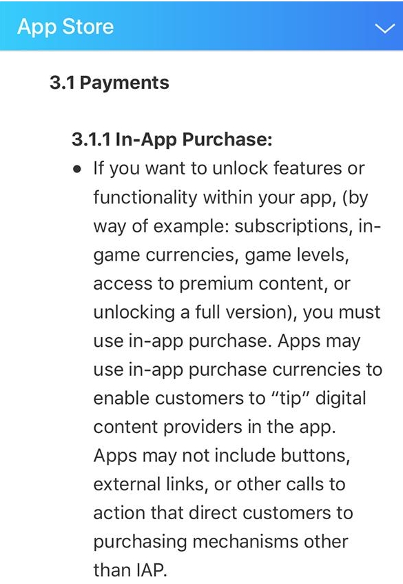 近日,蘋果公司終于將中國本土化創(chuàng)新“打賞”寫進(jìn)條款,并作出規(guī)定:App內(nèi)打賞必須使用蘋果官方支付渠道——APP內(nèi)購,并向蘋果支付分成;而且相關(guān)應(yīng)用不得采用其他按鈕、外部鏈接或其他方式讓消費(fèi)者使用蘋果之外的支付渠道。這也就意味著,蘋果將從贊賞功能中抽取30%的提成,也就是“蘋果稅”,如果拒絕執(zhí)行則有可能導(dǎo)致應(yīng)用下架。