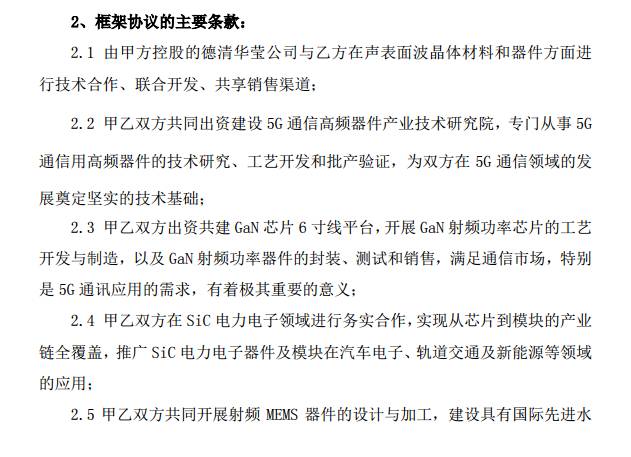 框架協(xié)議顯示:1、德清華瑩與信維通信將在聲表面波晶體材料和器件方面進(jìn)行技術(shù)合作、聯(lián)合開(kāi)發(fā)、共享銷售渠道;