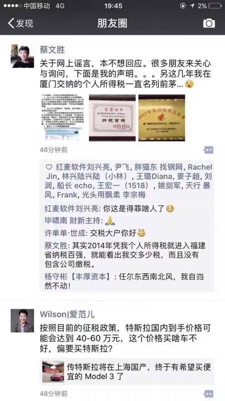 隨后,蔡文勝在本人的朋友圈中表示,自己在廈門繳納的個人所得稅一直名列前茅,反擊鼎麟股東對其騙稅的說法。