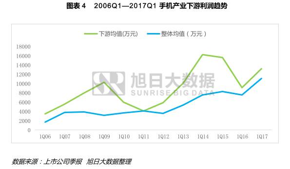 此外,根據(jù)旭日大數(shù)據(jù)中心數(shù)據(jù)顯示,在手機(jī)產(chǎn)業(yè)鏈上、中、下游中,僅有下游整體利潤(rùn)水平在產(chǎn)業(yè)鏈總利潤(rùn)水平之上;在一定程度上說明手機(jī)產(chǎn)業(yè)鏈下游端需求旺盛,將持續(xù)拉升中、上游的需求,從而帶動(dòng)整個(gè)手機(jī)產(chǎn)業(yè)鏈利潤(rùn)水平的持續(xù)增長(zhǎng),帶動(dòng)整個(gè)手機(jī)產(chǎn)業(yè)鏈的持續(xù)繁榮。