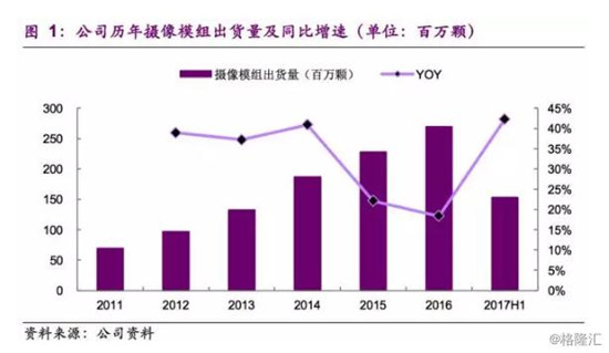 公司在車載鏡頭領(lǐng)域持續(xù)領(lǐng)跑,2017年上半年公司車載鏡頭出貨量為15.3百萬顆,同比增速達44.3%,增長再次提速。