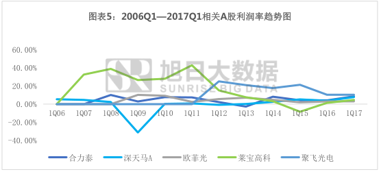 從2007年至2017年利潤率變動的方面來看,顯示屏部分的利潤率基本一直都低于手機產(chǎn)業(yè)鏈整體的利潤率水平;且自2010年之后隨著該部分競爭進一步加劇利潤率一直下行,到2015年由于與整體利潤率過度拉大才恢復(fù)性的反彈;利潤率的持續(xù)走低對利潤會形成一定的牽制,使得整個顯示屏部分的利潤一直不高,截止2017年一季度其利潤也只占整個手機產(chǎn)業(yè)鏈上市公司利潤的7.6% ;顯示行業(yè)競爭達(dá)到了混戰(zhàn)的狀態(tài),不同背景的廠商均有不同程度涉足顯示屏的行列。