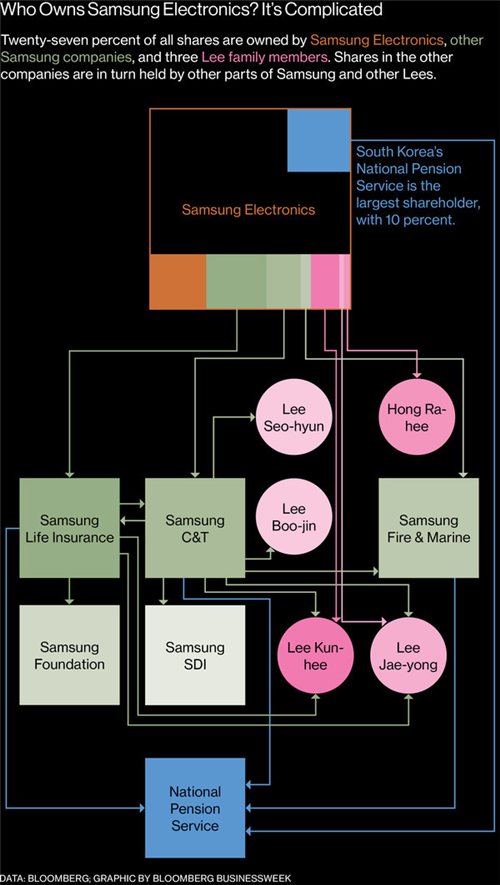 相比而言,李氏家族在三星的單一實(shí)體只擁有相對較少的股份,但卻通過復(fù)雜的交叉持股保持自己的控制權(quán)。