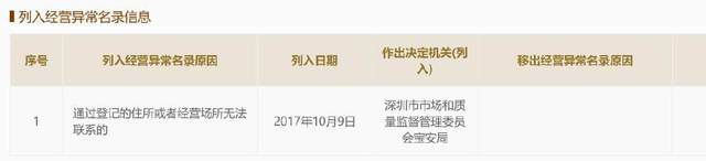 有趣的是,該公司還在幾天前被深圳市場監(jiān)管局列入了經(jīng)營異常名錄,原因是登記的住所無法取得聯(lián)系。