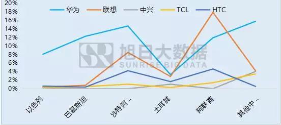 2016年中國各品牌在中東各國出貨量及市場份額