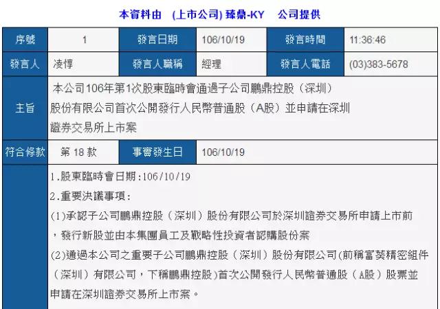 2017年10月21日,據(jù)海外媒體報道稱,臻鼎轉(zhuǎn)投資子公司——大陸廣東省深圳鵬鼎控股昨(20)日臨時股東會,通過首次公開發(fā)行人民幣普通股并申請股票大陸上市相關(guān)事項案。臻鼎19日特別為鵬鼎控股擬在大陸深圳上市召開股東臨時會,逾8成股數(shù)與會的情況下,23分鐘就通過,鵬鼎昨天立即召開股東臨時會通過,很快就會送件申請深圳IPO,依近期大陸審查進(jìn)度,如果一切順利可在明年掛牌,市場認(rèn)定是鴻海集團(tuán)首家赴陸IPO的企業(yè)。而臻鼎還是蘋果供應(yīng)商,為iPhone 8 軟板FPC主要供應(yīng)商之一!