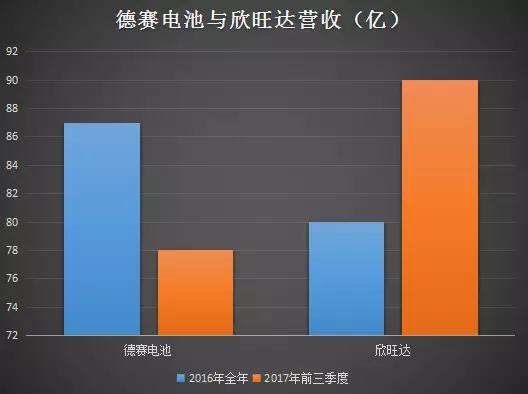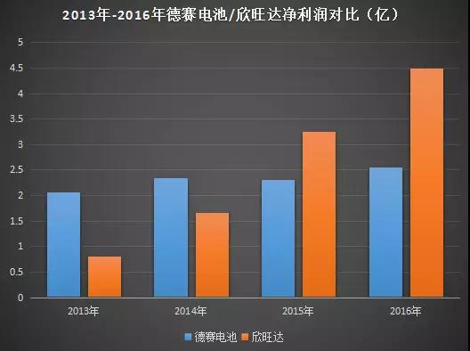 首先來看看兩者此前的營收,2013年-2016年,德賽電池每年的營收分別為44.02億、63.90億、84.34億、87.50億,2014年-2016年其營收同比增長分別為:45.14%、32.00%、3.40%;而欣旺達的營收在2013年幾乎只有德賽電池的一半22.03億,2014年-2016年每年都是快速增長,分別為42.79億、64.72億,80.90億元!2014年-2016年其營收同比增長分別為:94.21%、51.23%、25.01%!