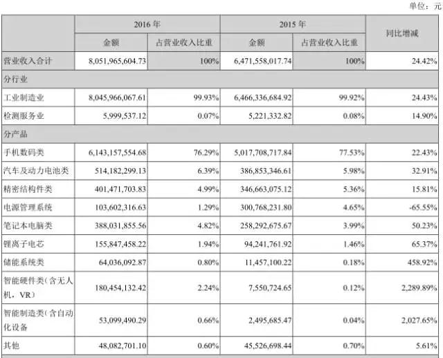 從兩者的營收業(yè)務(wù)來看,欣旺達當(dāng)前的營收主要來源于手機數(shù)碼等消費類電子市場鋰電池模組業(yè)務(wù),以其2016年為例,其中:傳統(tǒng)核心業(yè)務(wù)手機數(shù)碼類鋰離子電池模組實現(xiàn)營業(yè)收入61.43億元,同比增長22.43%;筆記本電腦鋰電池業(yè)務(wù)實現(xiàn)營業(yè)收入3.88億元,同比增長50.23%;汽車及動力電池業(yè)務(wù)實現(xiàn)營業(yè)收入5.14億元,同比增長32.91%;VR&穿戴設(shè)備、無人機、電子筆等新興智能硬件業(yè)務(wù)實現(xiàn)營業(yè)收入1.8億元,同比增長2289.89%。