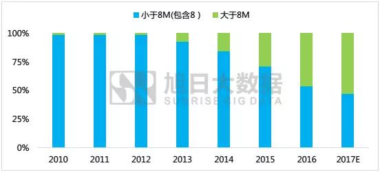 據(jù)旭日大數(shù)據(jù)統(tǒng)計(jì),2010年的手機(jī)攝像頭幾乎搭載的都是像素8M及以下的攝像頭,而到了2017年,搭載像素8M及以下的攝像頭手機(jī)就已經(jīng)不足一半,低端像素市場(chǎng)疲態(tài)趨勢(shì)日益嚴(yán)重。