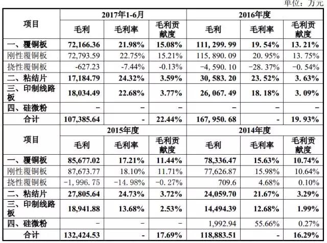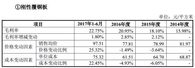 由上可知,覆銅板是公司最主要的利潤來源.報(bào)告期內(nèi),覆銅板貢獻(xiàn)的毛利額占主營業(yè)務(wù)毛利總額的比例分別為65.89%、 64.70%、 66.27%和67.20%.其產(chǎn)品毛利率的變動趨勢直接影響主營業(yè)務(wù)綜合毛利率的變動趨勢.而據(jù)數(shù)據(jù)顯示,其覆銅板的毛利率從2014年開始至今一直處于快速增長狀態(tài),從2014年的13.21%增長到今年上半年的21.98%!