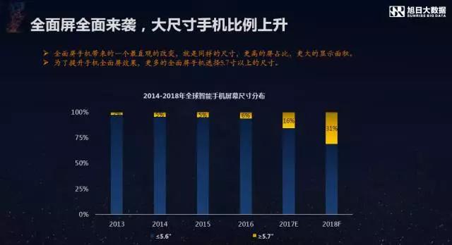 同時(shí),她認(rèn)為全面屏?xí)苿?dòng)大尺寸手機(jī)比例上升,以及更多的差異化方案出現(xiàn)。根據(jù)旭日大數(shù)據(jù)的統(tǒng)計(jì)和預(yù)測(cè),受益于全面屏手機(jī)的推動(dòng),5.7寸以上的手機(jī)比例將由2017年的16%左右快速上升至2018年的31%。未來(lái)在機(jī)型方面,據(jù)旭日大數(shù)據(jù)的調(diào)研,18年上半年,會(huì)有剛性面板的異形切割的形態(tài),規(guī)格也不僅限于18:9。而到18年下半年,國(guó)產(chǎn)全面屏手機(jī)將會(huì)全面開花,中端、中高端及高端市場(chǎng)都會(huì)有相關(guān)機(jī)型面世,產(chǎn)品形態(tài)除了有縮小額頭和下巴的,還會(huì)有配備柔性AMOLED的異形切割,產(chǎn)品規(guī)格也會(huì)進(jìn)一步豐富,甚至到19:9、19.5:9等。