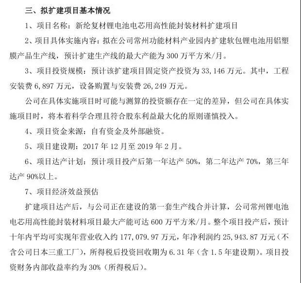 擴建項目達產(chǎn)后,與公司正在建設(shè)的第一套生產(chǎn)線合并計算,公司常州鋰電池電芯用高性能封裝材料項目最大產(chǎn)能可達 600 萬平方米/月。整個項目投產(chǎn)后,預(yù)計十年內(nèi)平均可實現(xiàn)年營業(yè)收入約 17.7億元,年凈利潤約 2.5億元(不含公司日本三重工廠)。