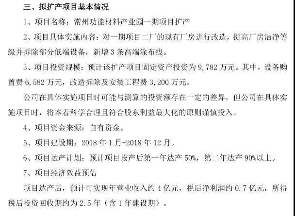 據(jù)了解,項目將對一期項目二廠的現(xiàn)有廠房進行改造,提高廠房潔凈等級并拆除部分低端設(shè)備,新增3條高端涂布線。預(yù)計該擴產(chǎn)項目固定資產(chǎn)投資為9782萬元。其中,設(shè)備購置費6582萬元,改造拆除及安裝工程費3200萬元。預(yù)計項目投產(chǎn)后第一年達產(chǎn) 50%,第二年達產(chǎn) 90%以上。項目達產(chǎn)后,預(yù)計可實現(xiàn)年營業(yè)收入約 4 億元,稅后凈利潤約 0.7 億元。