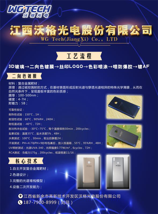 沃格光電本次重點展出的3D曲面玻璃,所采用的技術(shù)是沃格光電根據(jù)智能手機未來將要面對的核心應(yīng)用場景:5G、無線充電、藝術(shù)品味等,自主開發(fā)出來的創(chuàng)新技術(shù)與工藝,主要包括兩大核心技術(shù):針對用戶藝術(shù)品味提升的二向色鍍膜技術(shù),和攻克5G、無線充電應(yīng)用所需的DLC類金剛石膜技術(shù)。