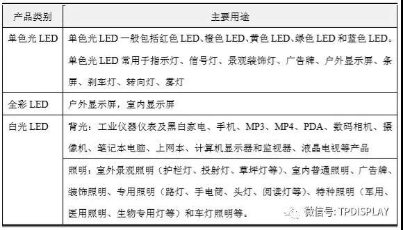 LED 屬于半導(dǎo)體光電器件范疇,依發(fā)光顏色分為單色光 LED、全彩 LED 和白光 LED。其中,白光 LED 主要用于背光和照明領(lǐng)域,用途較為廣泛。各色光LED 分類及應(yīng)用領(lǐng)域如下: