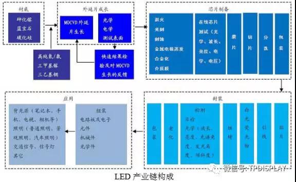 LED 產(chǎn)業(yè)具有典型的不均衡產(chǎn)業(yè)鏈結(jié)構(gòu),一般按照材料制備、芯片制備和器件封裝與應(yīng)用分為上、中、下游,雖然產(chǎn)業(yè)環(huán)節(jié)不多,但其涉及的技術(shù)領(lǐng)域廣泛,技術(shù)工藝多樣化,每一領(lǐng)域的技術(shù)特征和資本特征差異很大。