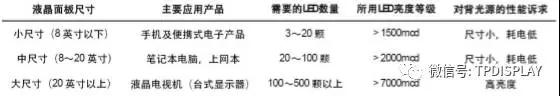 不同尺寸液晶屏對(duì) LED 背光源的數(shù)量及性能要求如下: